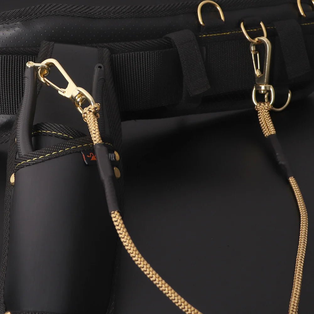 This model is rated for tools up to 6.6lb (3kg) and uses an elastic cord that stretches during use to support smooth tool handling and controlled reach during tasks. Compact metal hooks make it easy to attach smaller tools and belt hardware. Gold-finished hardware improves durability and visibility while maintaining a clean, professional look.