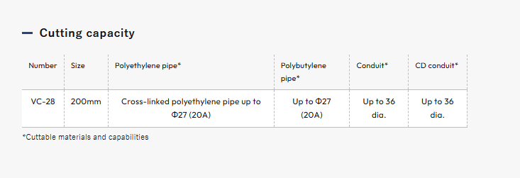 | Cutting – PE / PB Pipe | Up to Ø1.06" (Ø27 mm) |